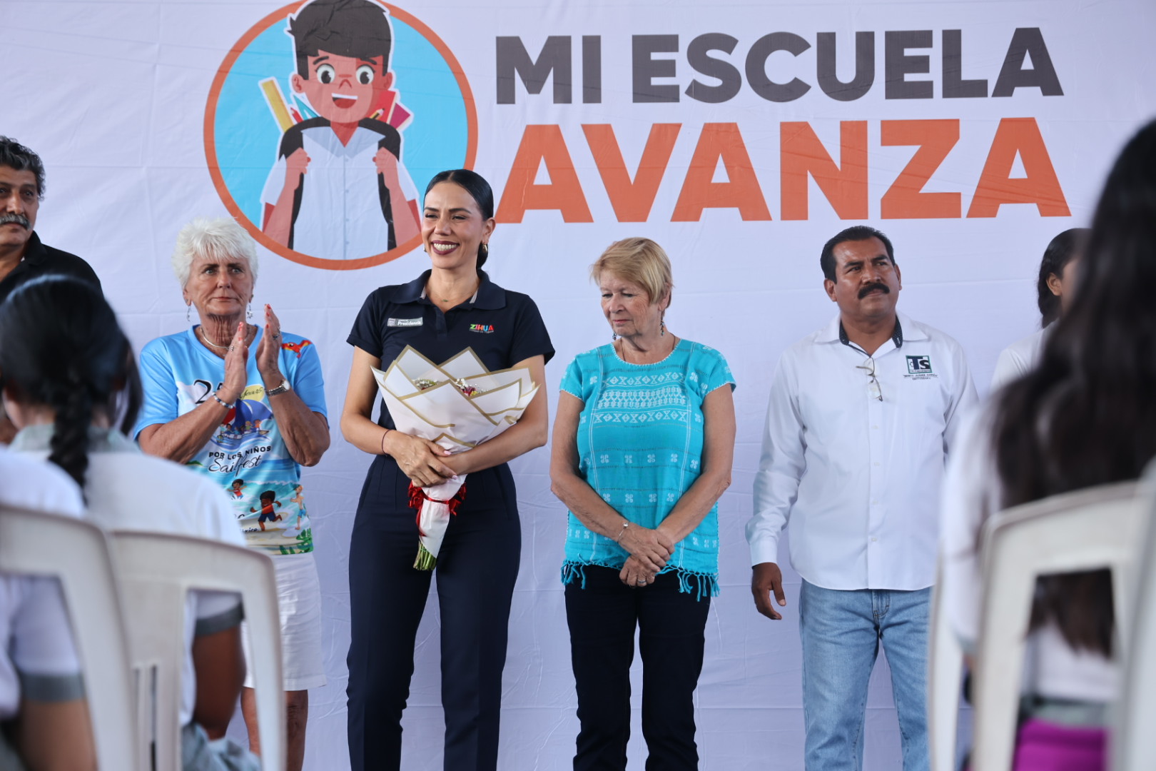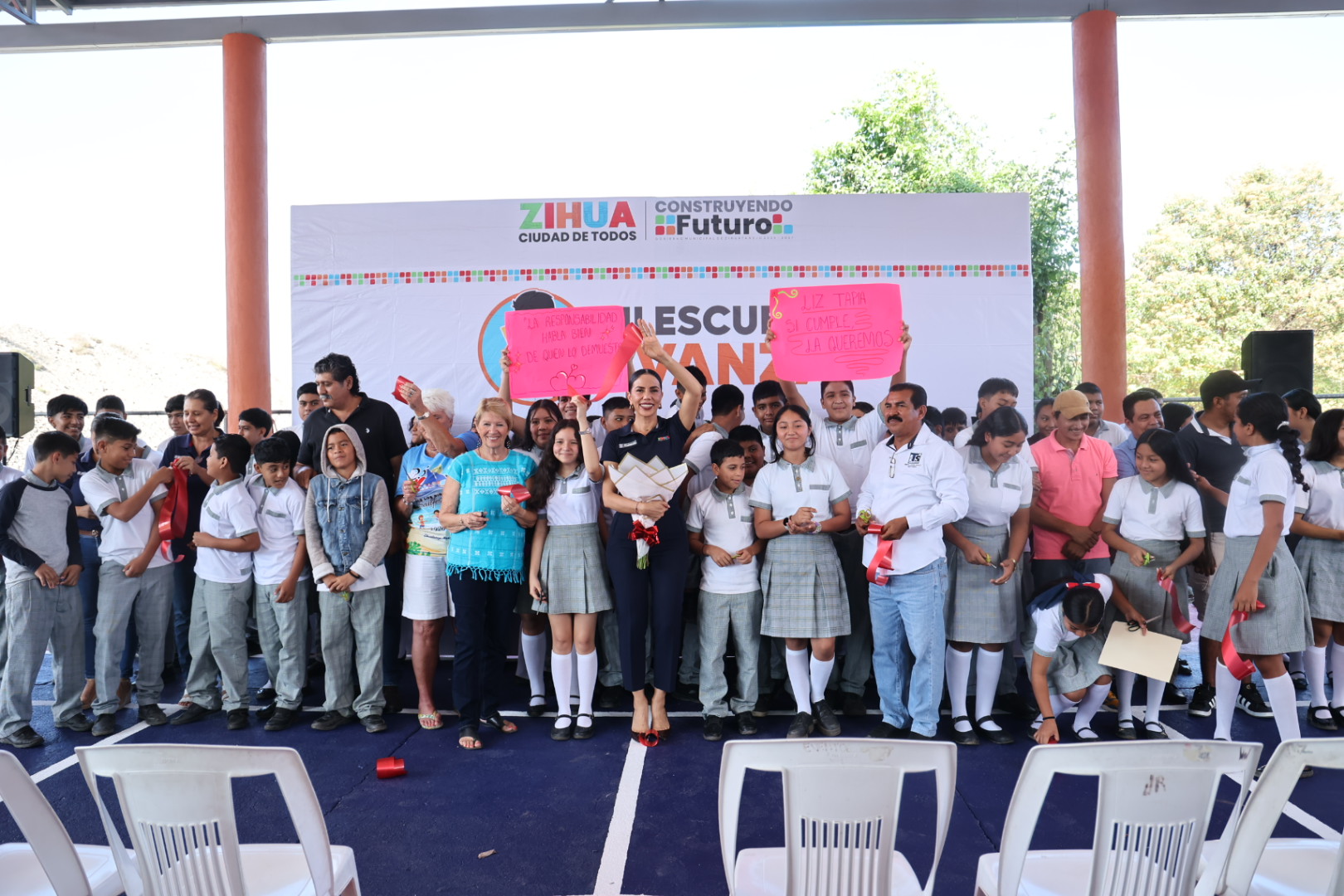 En su intervención, la presidenta Tapia Castro expresó su satisfacción porque, a tres meses de que alumnos, padres de familia y maestros pidieron su apoyo para poder construir el techado de la plaza cívica de la escuela, hoy pudo acudir al plantel para inaugurar dicha obra, en cuya ejecución se invirtieron recursos del programa La Escuela es Nuestra y del gobierno que ella encabeza.