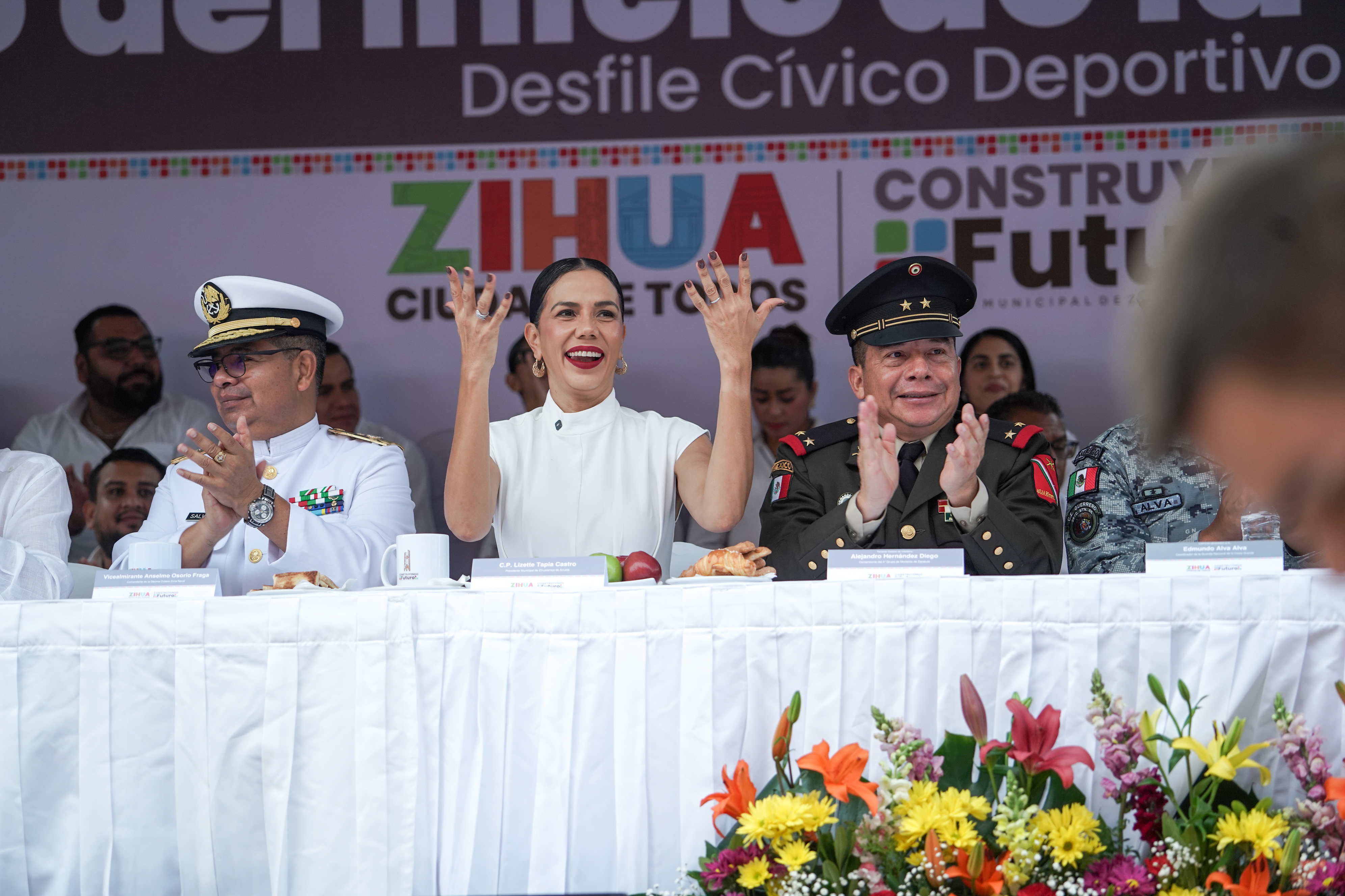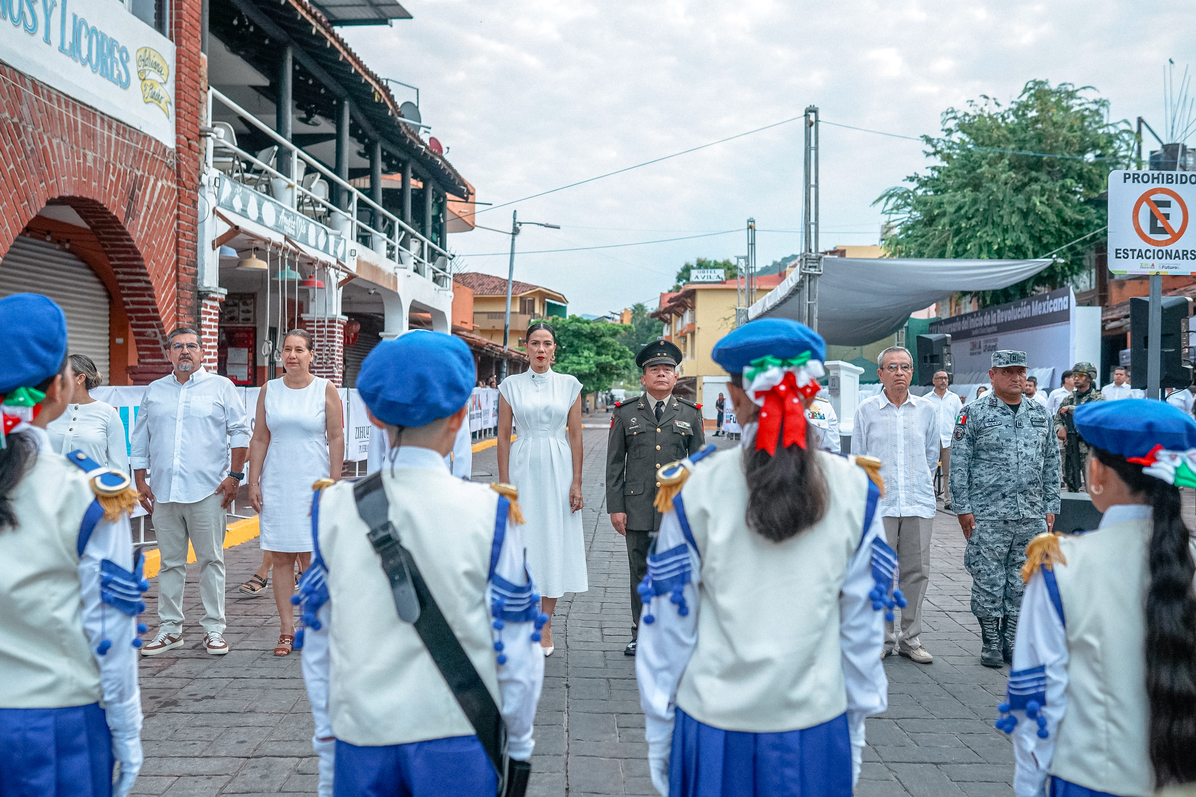 Desde el presídium de honor instalado junto a la Cancha Municipal del puerto, la alcaldesa Tapia Castro, acompañada de autoridades civiles y militares, se mantuvo atenta al paso de cada uno de los contingentes, que recorrieron parte de la calle Juan Álvarez y otras vialidades de la zona centro de la cabecera municipal.
