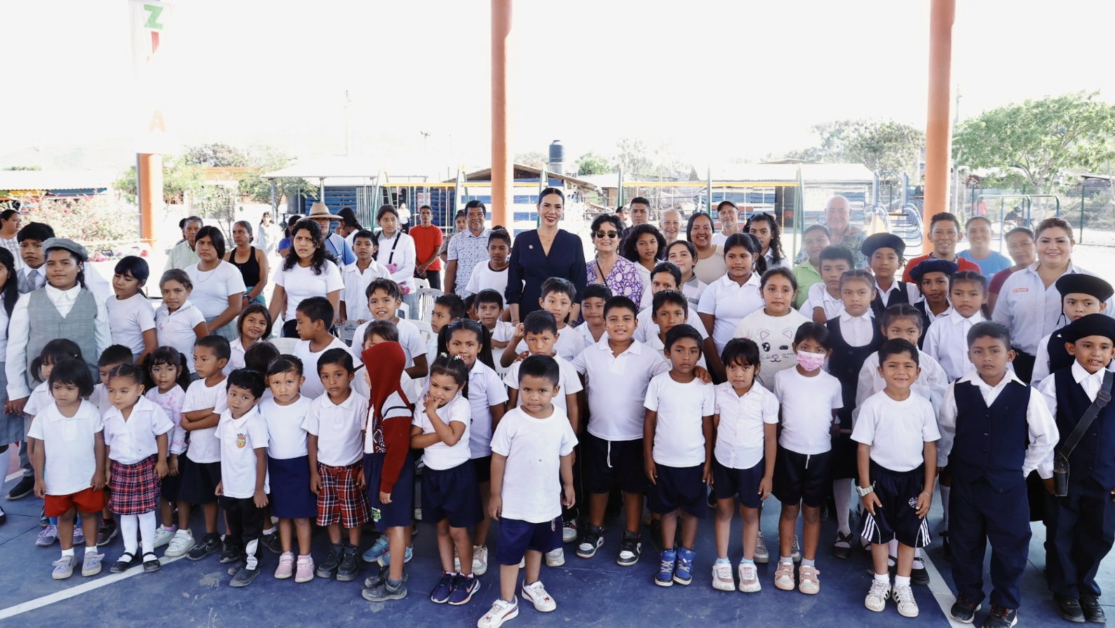 Zihuatanejo, Gro., 12 de marzo de 2026.- A menos de un mes de haber inaugurado una cancha de usos múltiples en la escuela Nueva Manitoba en México, en la que su gobierno aportó un importante monto de recursos, la presidenta Lizette Tapia Castro regresó este jueves a dicho plantel educativo, ubicado en la colonia Alta Vista de Zihuatanejo, donde entregó instrumentos para la Banda de Guerra y una réplica de la Bandera Mexicana, en beneficio de más de 130 alumnos de preescolar, primaria y secundaria.