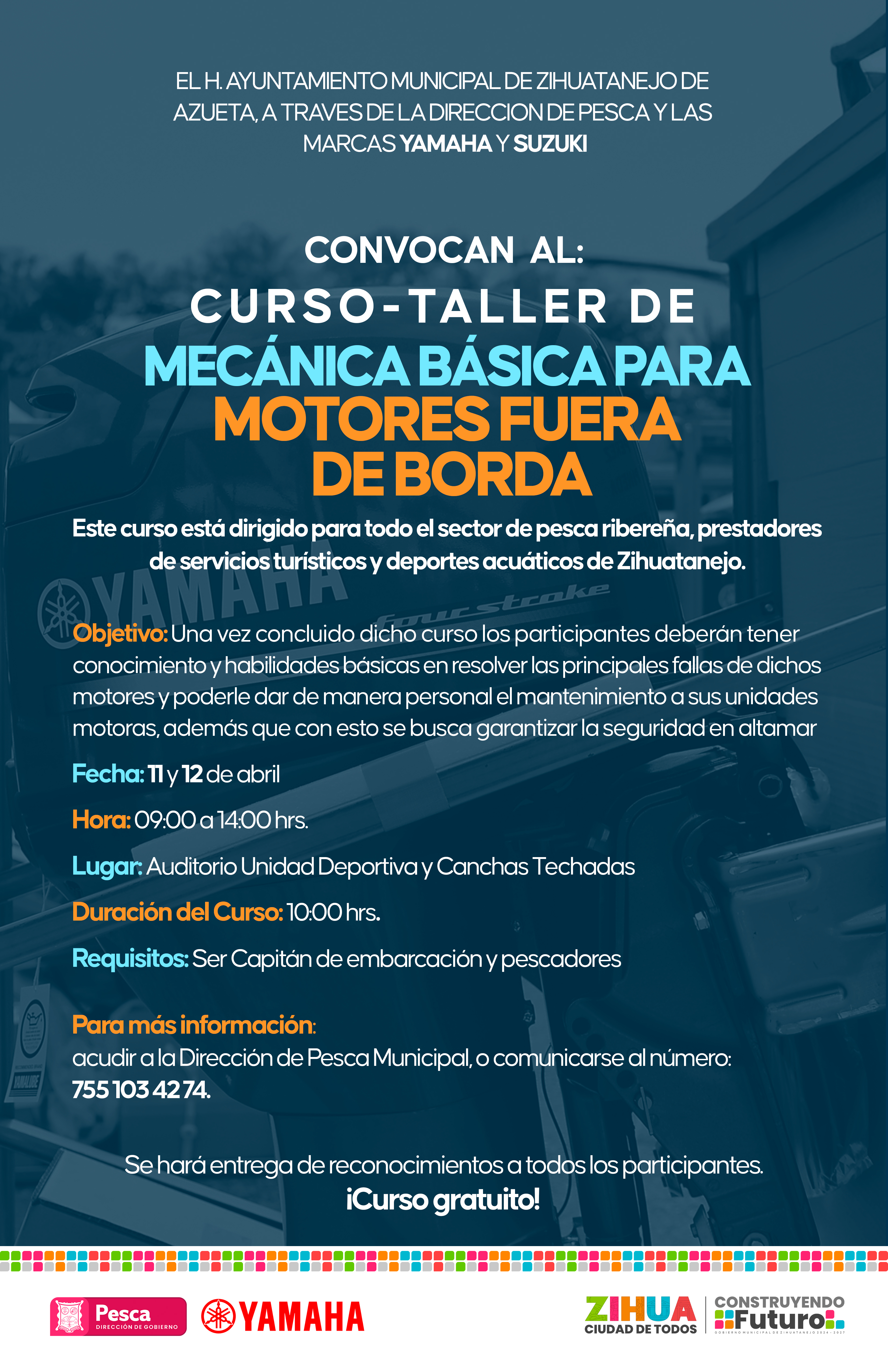 Al respecto, el director de Pesca en el municipio, César Pineda Hernández, informó que esta nueva capacitación se impartirá durante los días 11 y 12 del presente mes, para lo cual vendrán a Zihuatanejo 12 técnicos especializados de las prestigiadas empresas Yamaha y Suzuki.